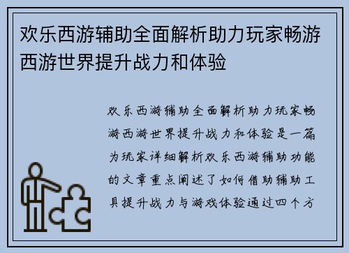 欢乐西游辅助全面解析助力玩家畅游西游世界提升战力和体验