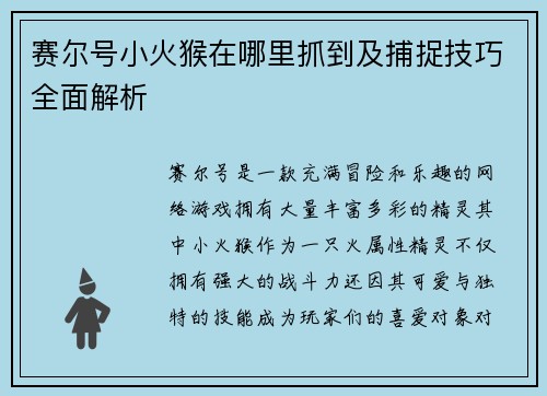 赛尔号小火猴在哪里抓到及捕捉技巧全面解析